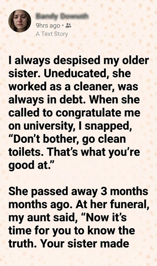 “She never got a proper education or a good job because she wanted you to have it all,” my aunt said softly. “It was a family secret. She forbade everyone from telling you. She said if you knew, you’d feel pressured. Or guilty. She wanted you to succeed freely.”