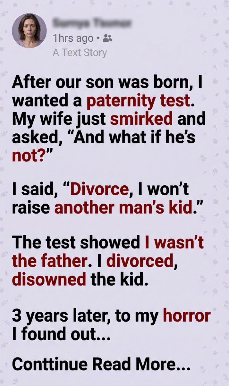 Three years later, that certainty collapsed in a coffee shop. A mutual friend revealed the truth: the lab had made a mistake. Emma had been faithful all along, and the child I abandoned was biologically mine. By the time the error was proven, I had entirely blocked her from my life.