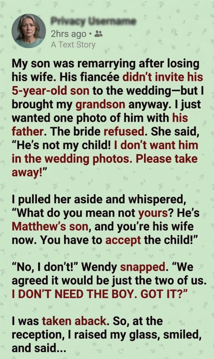When my son Matthew announced he was getting married again, I wanted to be happy for him. But deep down, I felt uneasy — especially when I realized his fiancée, Wendy, had no interest in getting to know Alex, my five-year-old grandson. Alex had been living with me ever since his mother passed away.