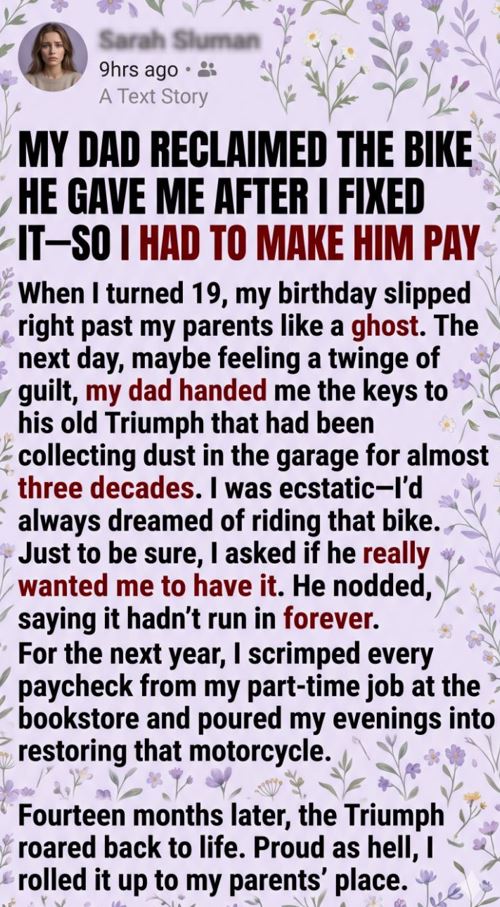 The paper slipped from my trembling fingers, fluttering to the floor like a dying bird. My vision blurred. A sound escaped me, a ragged gasp of absolute horror. He hadn’t just reclaimed the bike; he had reclaimed the last piece of a life I never knew was mine.