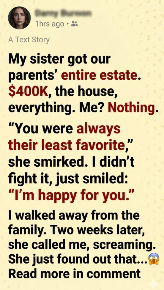 “The house… it’s mortgaged twice,” she continued, her voice shaking now. “The bank is already calling. And the ‘$400K’? It’s not cash—it’s tied up in some failing business Dad invested in before he died. I can’t even access it!”