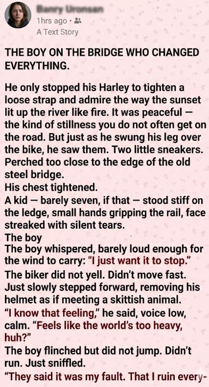 He stopped running that day. Jack ended up becoming a fierce advocate for the kid, working with social services to get him into a safe environment with an aunt who actually cared. He became the boy’s mentor, showing up to every baseball game, every graduation, every bad day, with that loud, rumbling Harley. The boy on the bridge grew up to be a counselor who saved hundreds of others, all because one stranger stopped to tighten a strap, saw the pain, and decided not to look away.